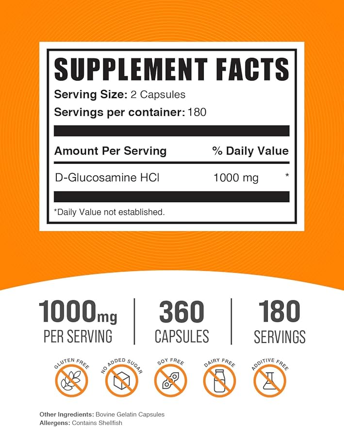 - ✔️ No Unwanted Extras but sourced from Shellfish!: Each serving of our Glucosamine HCl capsules, or Glucosamine 1000mg, is free of any gluten, soy, dairy and added sugars. Plus, our Glucosamine capsules contain no artificial flavors but it's sourced from shellfish! Do not take it when you have shellfish sensitivities! Enjoy the nutritional benefits without worrying about anything extra in your system.