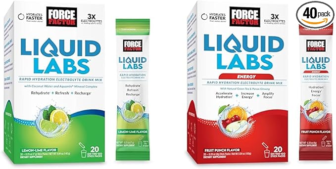 Bundle of FORCE FACTOR Liquid Labs Electrolytes Powder, Hydration Packets to Make Electrolyte Water with 5 Vitamins, Minerals, and Antioxidants, Lemon-Lime + Energy Fruit Punch Flavor, 40 Stick Packs