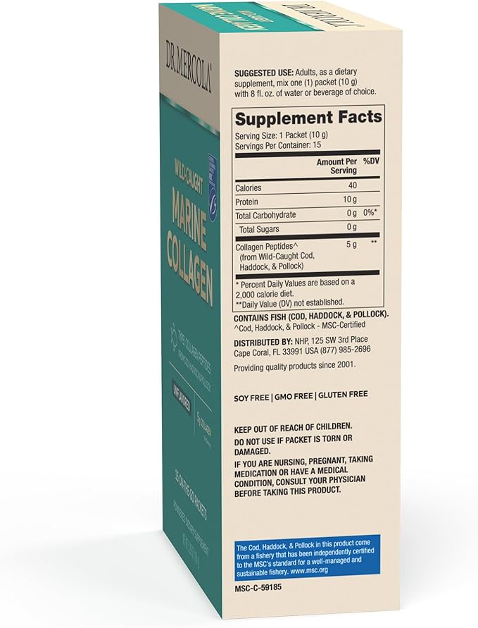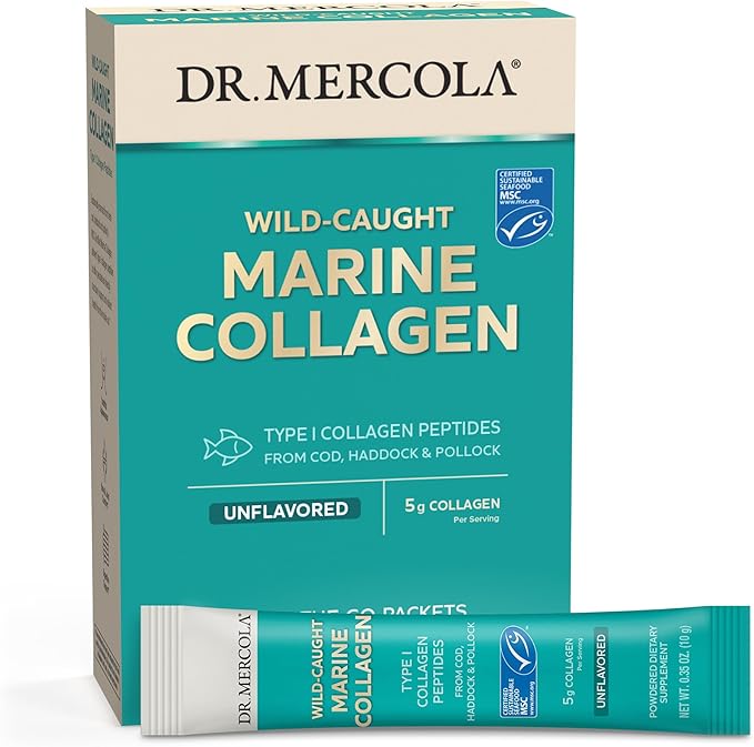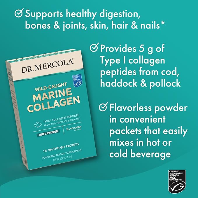 Dr. Mercola Marine Collagen Powder Packets, 5g Collagen Per Serving, 15 Servings (15 on-The-go Packets), Powdered Dietary Supplement, Unflavored, Type 1 Collagen Peptides from Cod, Haddock & Pollock