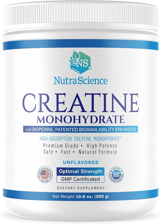 NutraScience Creatine Monohydrate Powder with BioPerine, Supports Lean Muscle Growth and Recovery, 60 Servings, 5000mg Per Serving, Unflavored, GMP sertified, Vegan Friendly, Non GMO