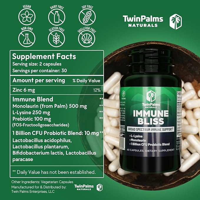 Immune Bliss - Broad Spectrum Daily Wellness Support for Seasonal Sickness | L-Lysine Monolaurin Probiotic Prebiotic Blend | Provides Natural Defense | Vegan Vegetarian Non-GMO | 60 Capsules