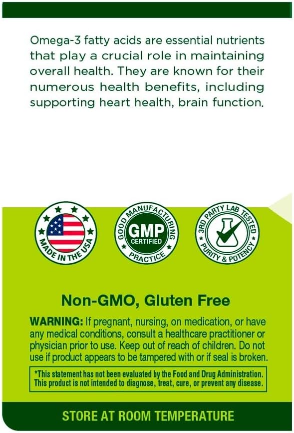 - HIGHEST QUALITY MADE IN USA – All of our products are manufactured in the USA with ingredients sourced from around the world. Manufactured at a cGMP compliant facility with rigorous testing protocols and made with naturally sourced ingredients, you can guarantee real natural purity, potency, and effectiveness with the extensive quality testing done on our products. This daily dietary supplement provides 300mg of Omega-3 to improve your heart and brain health for a happier, healthier life.