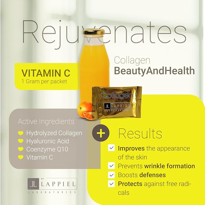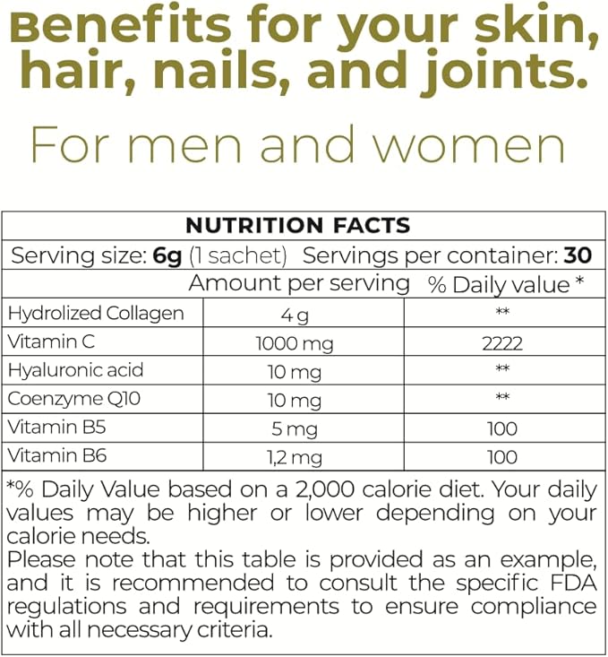 - Power-Packed Nutritional Composition: Each packet is a powerhouse of nutrition, boasting 4 grams of collagen, complemented by 1g of Vitamin C, 20mg of hyaluronic acid, and 20mg of coenzyme Q10, all working synergistically for your health and beauty.