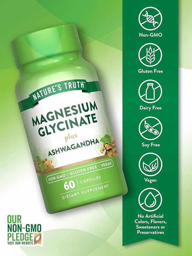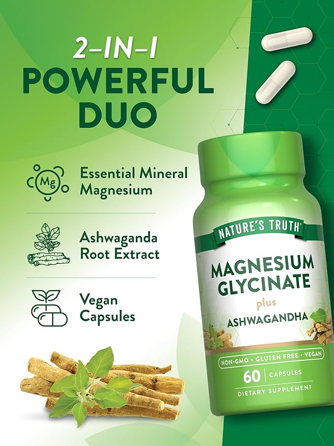 Nature's Truth Magnesium Glycinate with Ashwagandha | 60 Capsules | Vegan, Non-GMO & Gluten Free Supplement