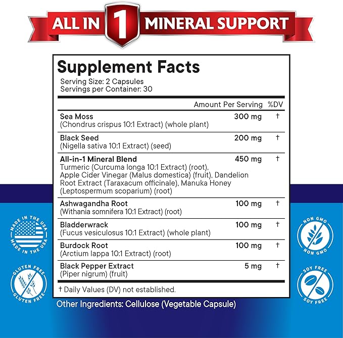 - The Raw Silica Sea Moss and Black Seed Oil Capsules You’ve Been Craving - New Age's All in 1 Mineral Support provides 6 full products in one, a full Irish Sea Moss Powder, Black Seed Powder, Ashwagandha Extract, Bladderwrack Powder, and Burdock Root Powder in a convenient 2 capsule dosage! You now have access to irish sea moss wildcrafted, black seed, ashwagandha powder, bladderwrack herb and burdock root pills have been packed into one convenient solution that's quick and easy to take.