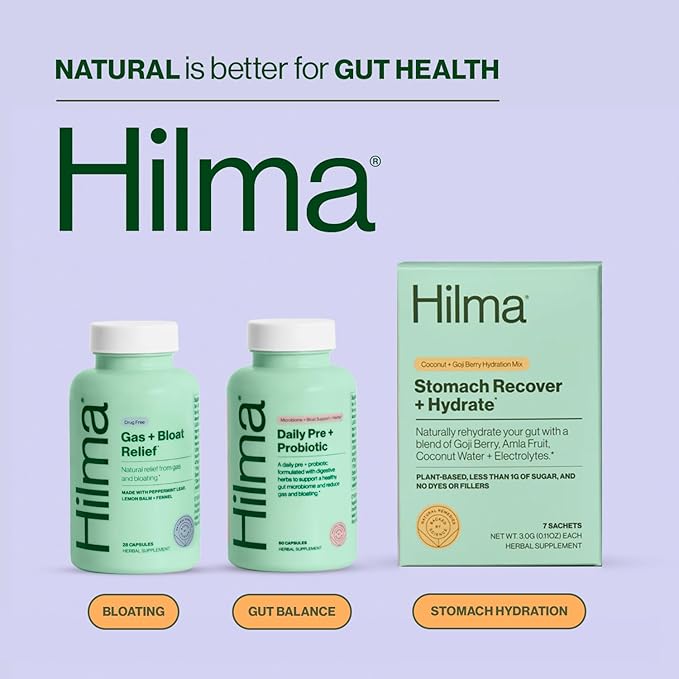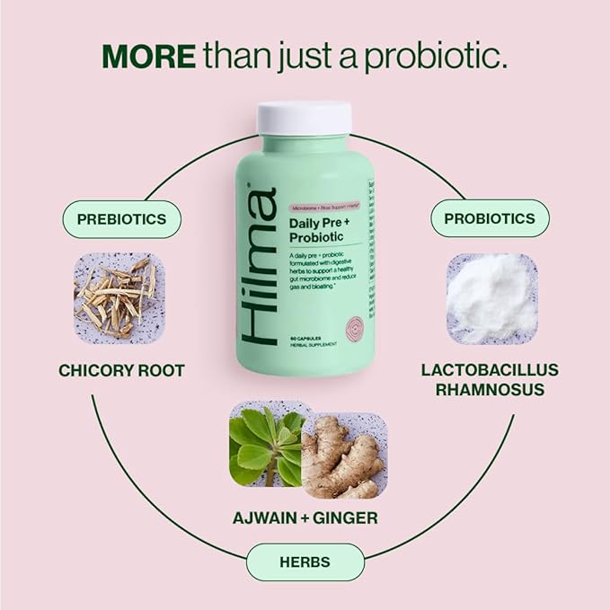 Hilma Pre and Probiotic with Herbs - Support Gut Health with Prebiotics and Probiotics, Plus Gas and Bloating Relief for Women & Men, 60 Vegan Capsules