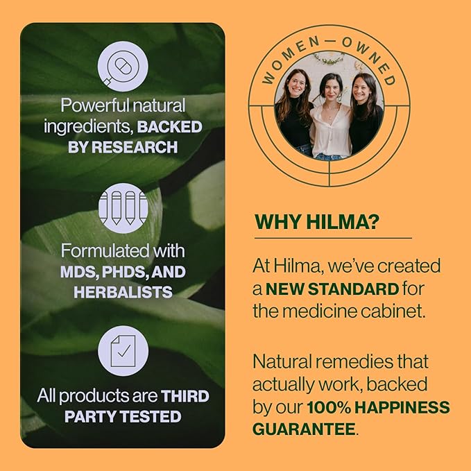 - Hilma’s story: We are a woman-owned and led company that believes increating a new standard for the medicine cabinet - natural remedies that actually work with a 100% happiness guarantee on each order