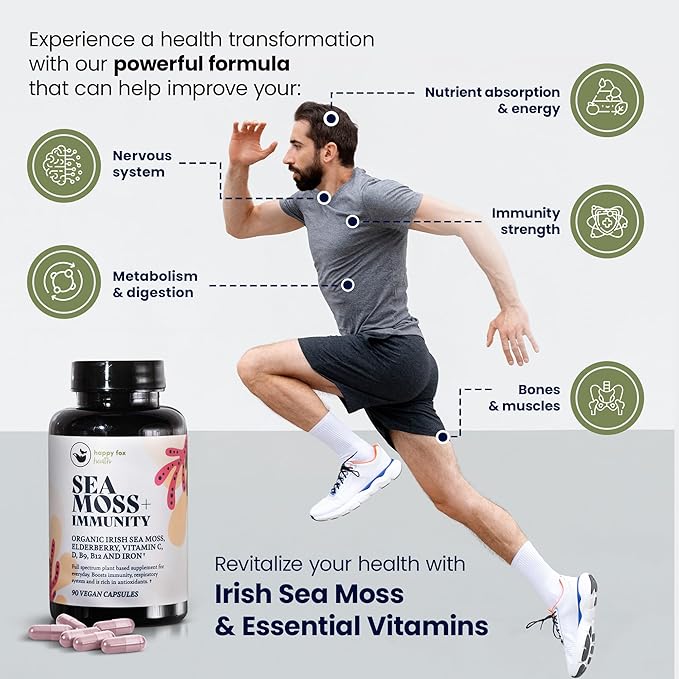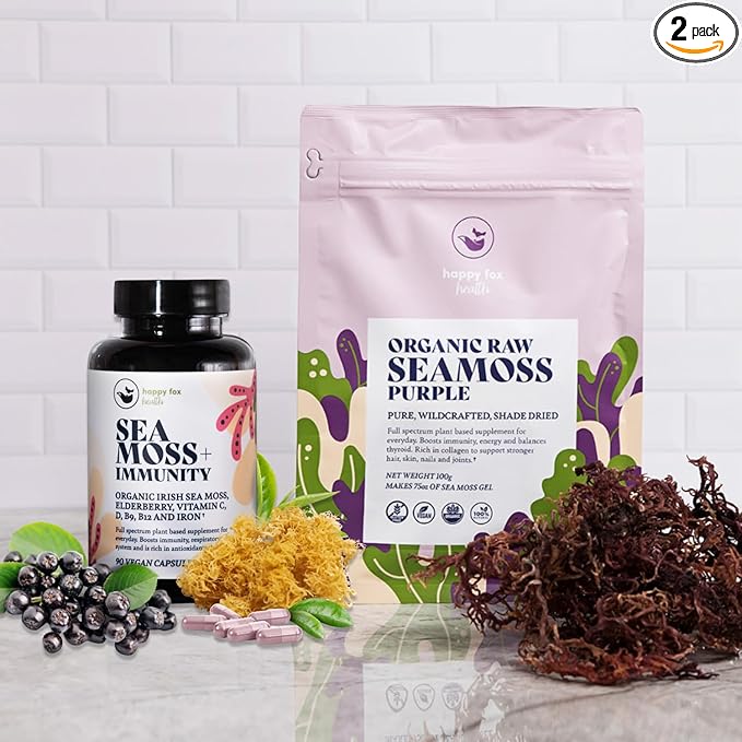 - ORGANIC PURPLE SEA MOSS & IMMUNITY CAPSULES BUNDLE: Feel the benefits of nature’s mutli-vitamin. Nutrients found in sea moss balance thyroid, lubricate joints, and relieve congestion. The addition of sambuccus elderberry 7 in 1 Immunity capsules which include - Vitamin C, D B9, B12, Iron will have you fortified from within.