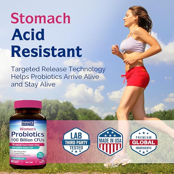 Innate Vitality Probiotics for Women, 100 Billion CFUs 18 Strains, Prebiotics and Probiotics, with Cranberry, Vitamin C & B6 P5P, Vaginal & Digestive Health, Non refrigerated, 60 Caps