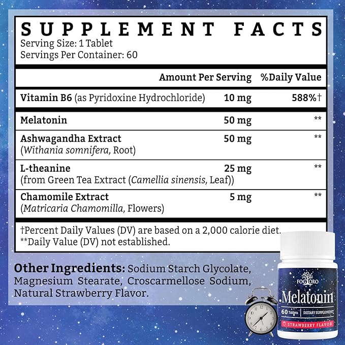 - High dose of Melatonin:Our Melatonin supplement contains 50mg of Melatonin per tablet, along with other natural ingredients such as L-Theanine (25mg), Magnesium (5mg as magnesium citrate), Ashwagandha (50mg), Vitamin B6 (10mg as Pyridoxine Hydrochloride), and Chamomile Extract (5mg Matricaria chamomile flowers)
