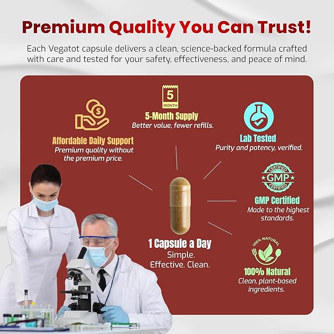 - ️ PURE INGREDIENTS, PURE PEACE OF MIND: Vegatot is committed to providing pure and high-quality supplements. Our ingredients are tested strictly by 3rd party labs to ensure purity and safety. They are vegan-friendly and free from additives, preservatives, and common allergens such as gluten, wheat, dairy, soy, sugar, and yeast. Therefore, you can feel good about what you're putting into your body.