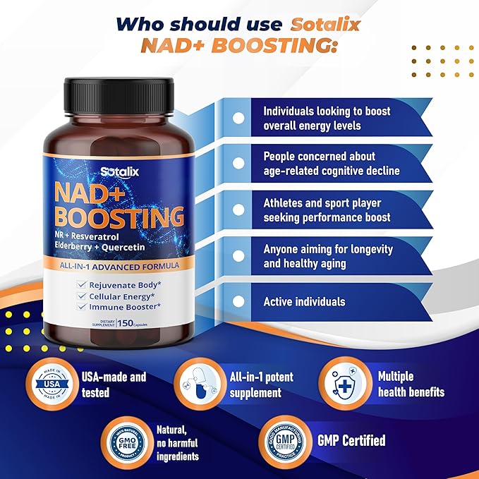 - 100% Natural - Safe And Effective: Sotalix NAD+ Boosting has been tested by 3rd-party labs and is free from any harmful chemicals - does not contain fillers magnesium stearate, dioxides, preservatives, gluten, soy, sugar, yeast, starch, non-gmo.