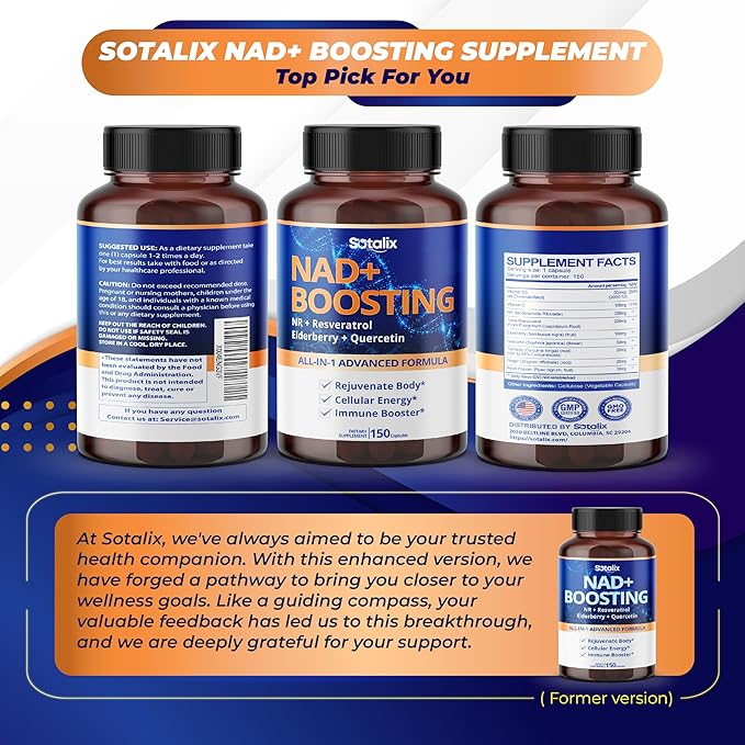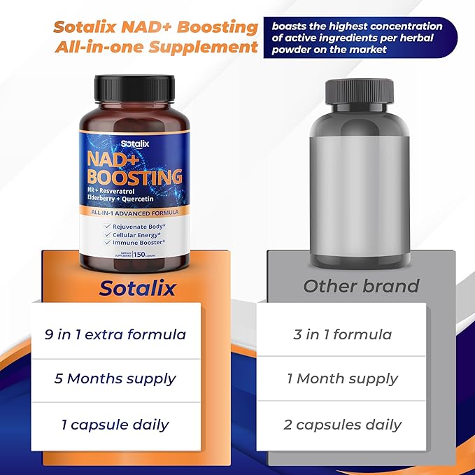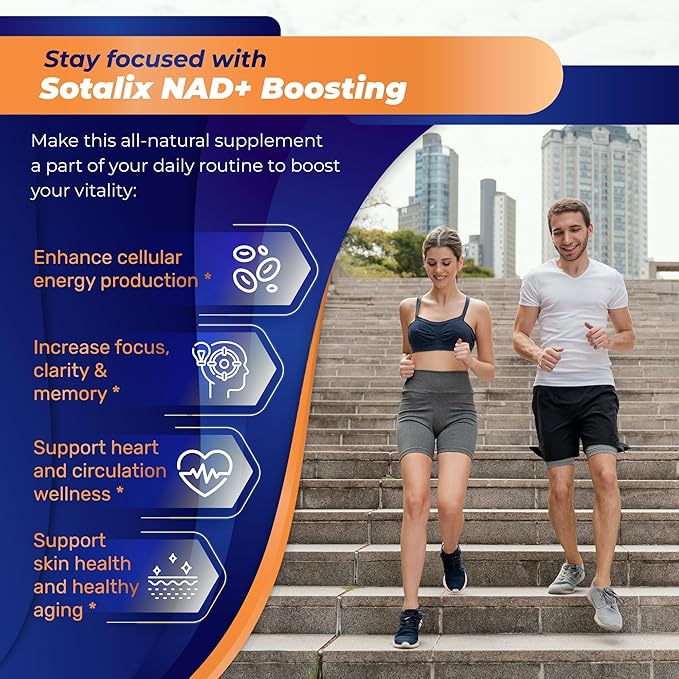 - Maximize Your Potential: Sotalix NAD+ Boosting is a potent supplement, delivering per serving and 150 capsules per bottle. This remarkable formula is meticulously crafted to elevate your overall well-being and vitality.