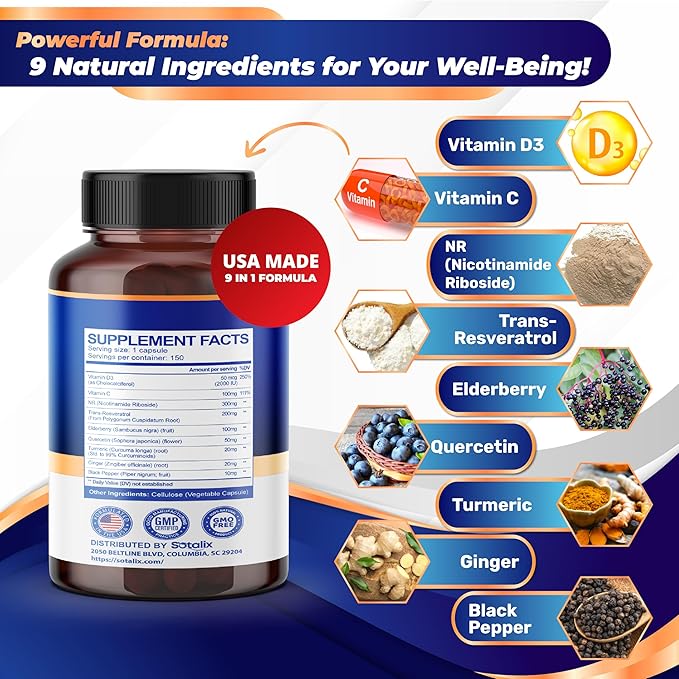 - Advanced 9-in-1 Formula: These powerful ingredients consist of Vitamin D3, Vitamin C, NR, Trans-Resveratrol, Elderberry, Quercetin, Turmeric, and Ginger. Additionally, Black Pepper is added to ensure that the compound is easier to absorb.