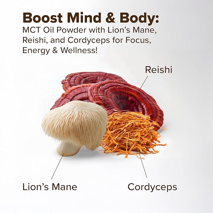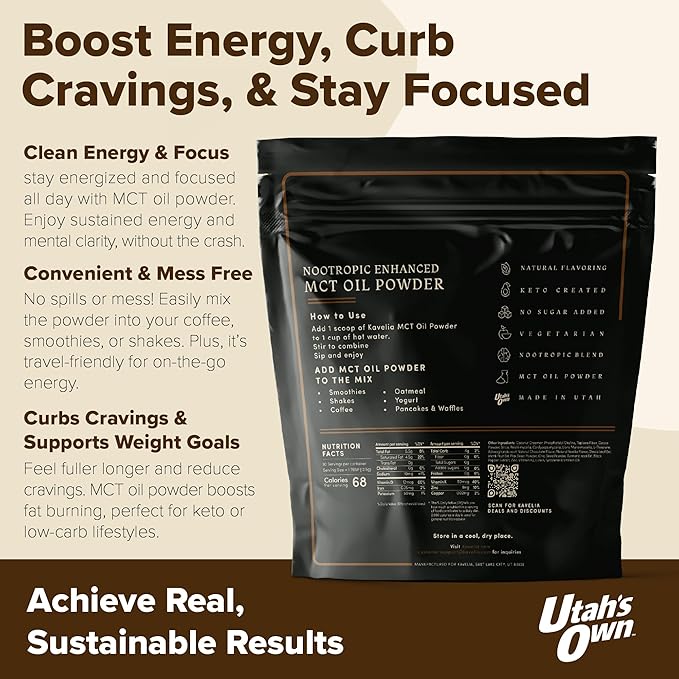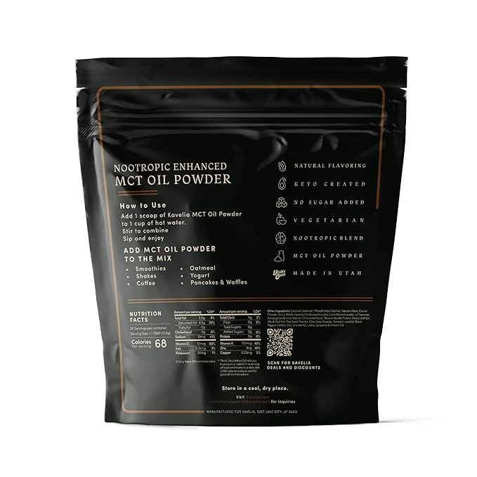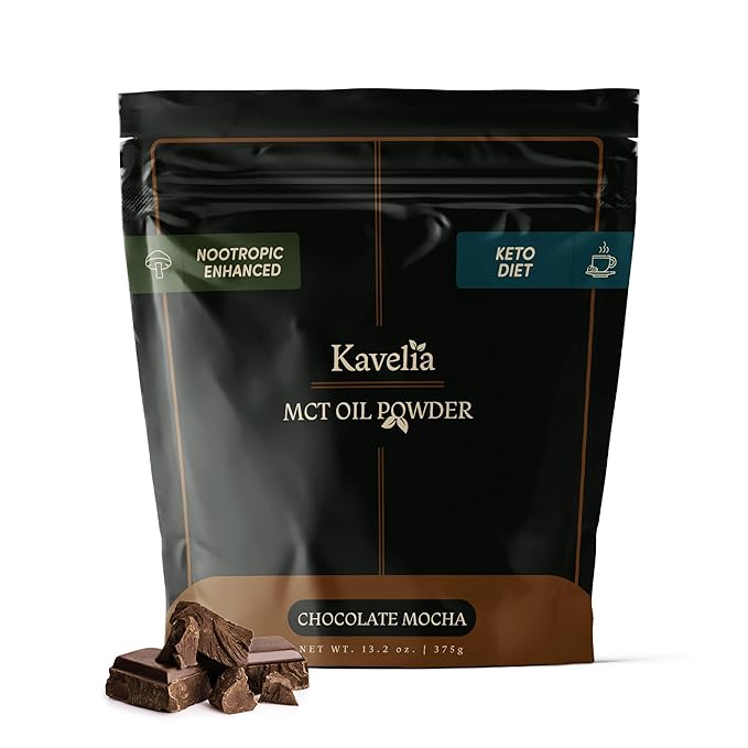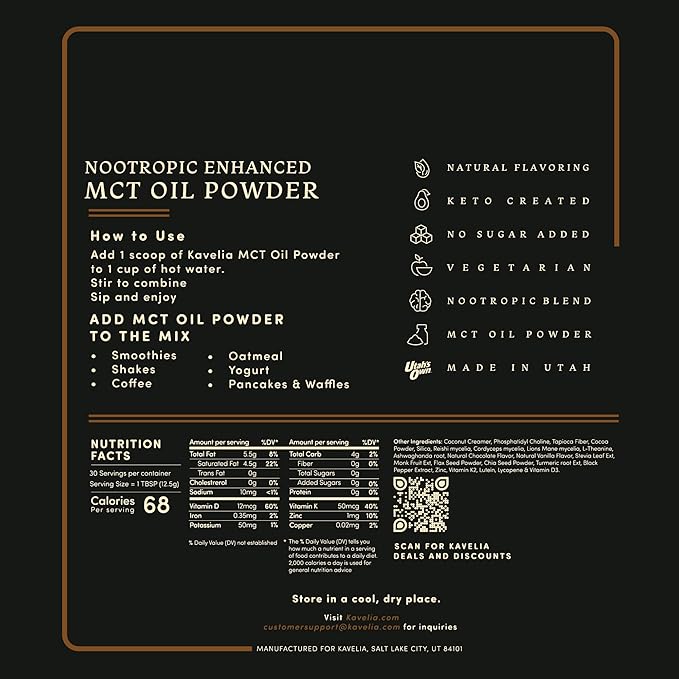 - BOOST YOUR ENERGY AND FOCUS: Kavelia MCT Oil Powder. Each scoop provides 9 Grams of MCT per serving. This non-dairy ketogenic vegan coffee creamer is enhanced with nootropic mushrooms to help improve cognitive function and provide a natural energy boost. Perfect for starting your day or as a pre-workout boost.
