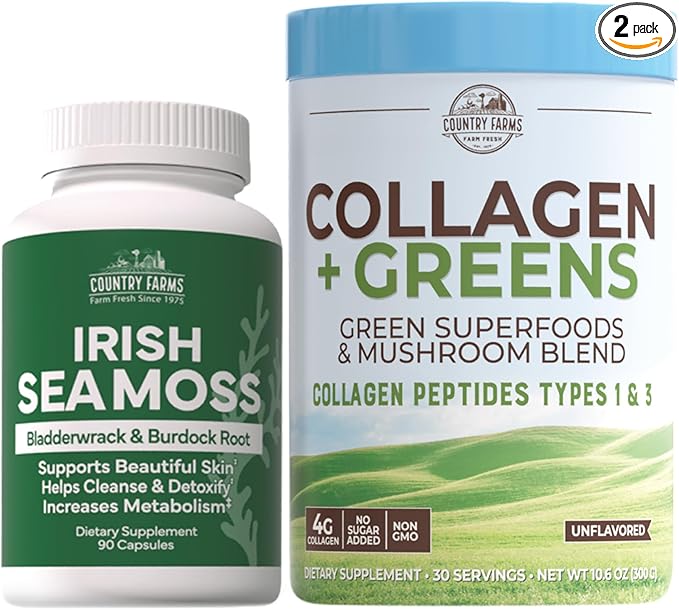 - YOUTHFUL RADIANCE BLEND. Unleash the power of Country Farms Collagen + Greens Powder and Country Farms Irish Sea Moss Capsules to enhance your beauty from within. Collagen revitalizes skin, hair, and nails, while Irish Sea Moss provides a nutritional boost for a radiant and youthful complexion
