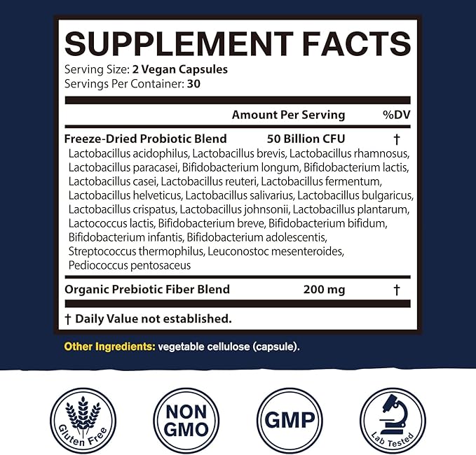 Probiotics 50 Billion, 23 Strains with Organic Prebiotics, Digestive & Immune Support, Freeze-Dried, Delayed-Release, Better Than a Dozen Yogurts, 60 Vegan Caps