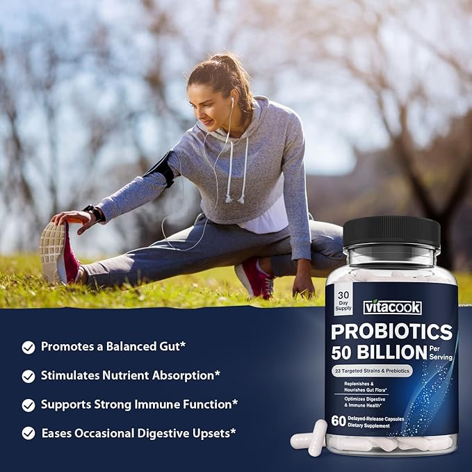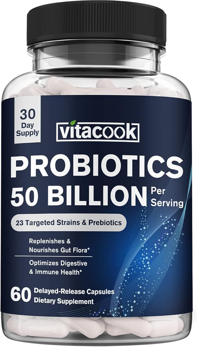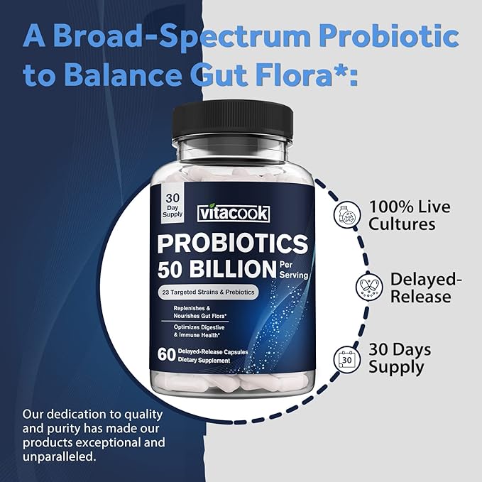 - 50 Billion CFUs Ultimate Flora Care*: Vitacook Probiotics for women & men has a whopping 50 billion CFUs from 23 specially-selected live strains per serving to provide broad support for a healthy gut microecology.* Each vegan capsule is enriched with organic prebiotic fuel to nourish the friendly organisms lining the gut.* Get our powerful gut-loving supplement, and you can enjoy more beneficial critters than a dozen yogurts with no worry about lactose or sugar.*
