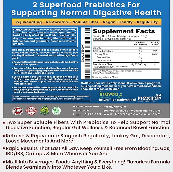 Kidney Restore Organic Acacia & Psyllium Husk Fiber Powder - Prebiotic & Natural Supplement - Soluble Acacia & Psyllium Husk Powder - 1.5 lbs (48oz), 2 Packs