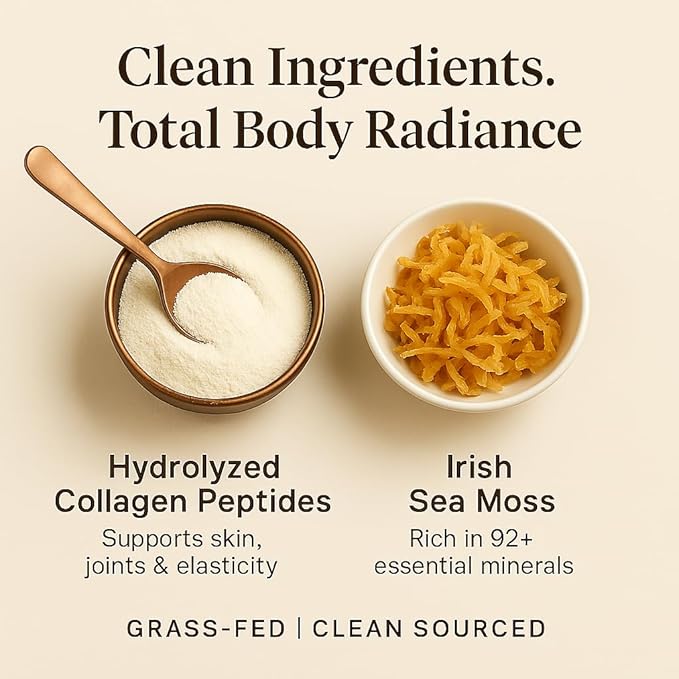- Revitalize Your Body with Irish Sea Moss: Experience the unique combination of collagen and Irish Sea Moss in our supplement. Rich in vitamins, minerals, and antioxidants, this formula acts as a natural detox and energy source, bolstering your overall health and improve your immune system. It's the ideal daily supplement for a more energized, younger feeling you, enriching your natural beauty and well-being from within