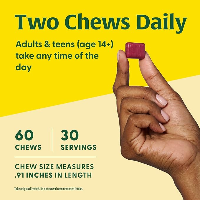 - TASTY GRAPE SOFT CHEWS: Adults take two soft chews daily any time throughout the day; Individually wrapped, so you can conveniently carry your chews on-the-go; 3 g of sugar per 2 chew serving