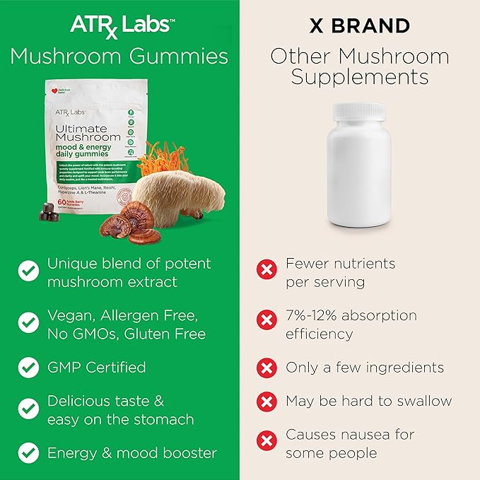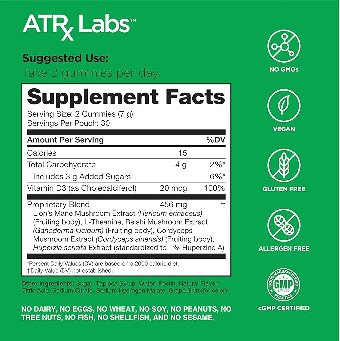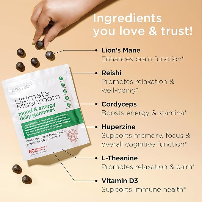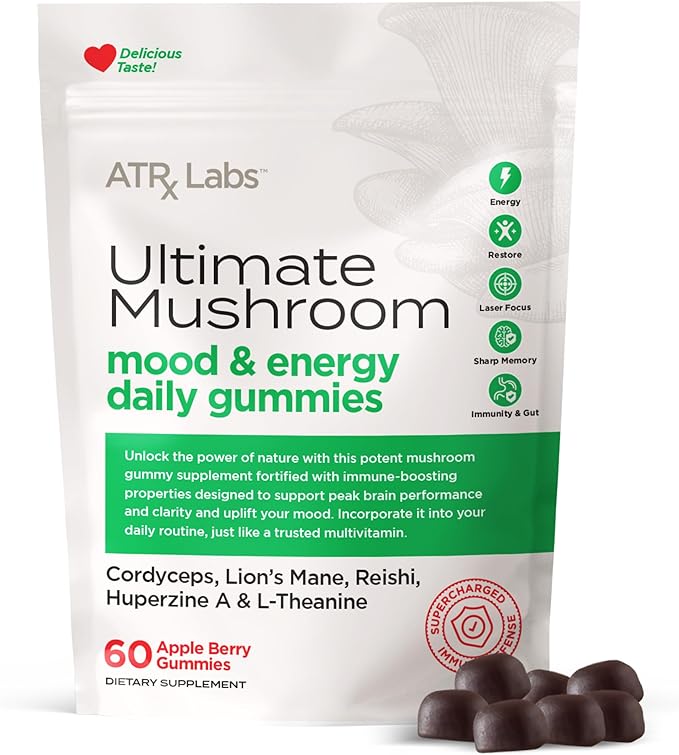 - ATRx Labs Ultimate Mushroom Daily Gummies - Mushroom Gummies with Cordyceps, Lion’s Mane, and Reishi, Plus Huperzine A & L-Theanine, May Improve Mood and Energy, Apple Berry Flavor, 60 Gummies.