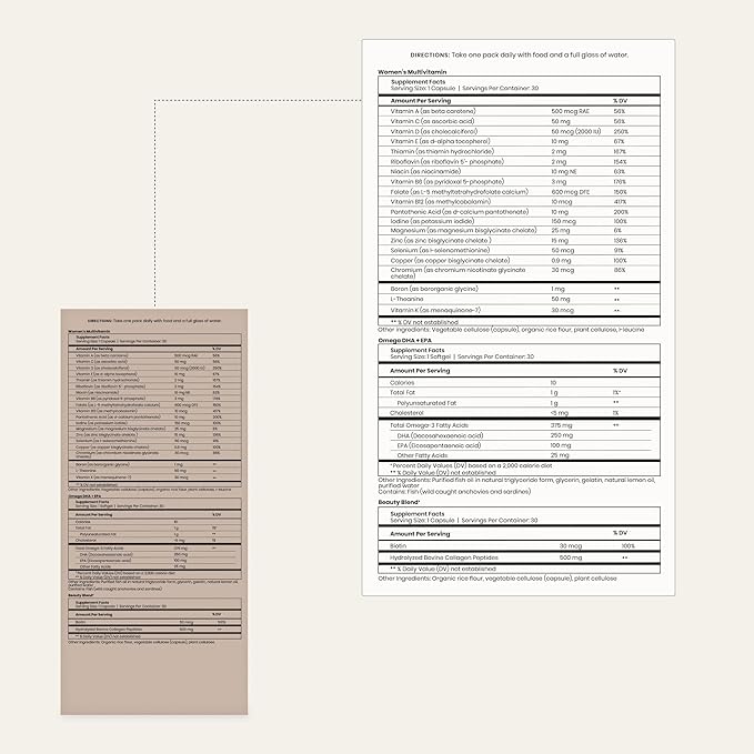- One Daily Vitamin Routine - Each pill pack includes a womens multivitamin, Beauty Blend* capsule and Omega 3 supplement. The trio is designed to help support your general and reproductive health, immunity, mood, hair, skin, and more.*