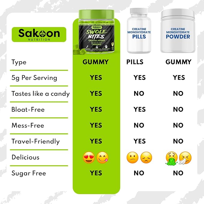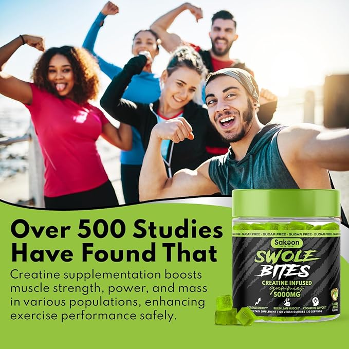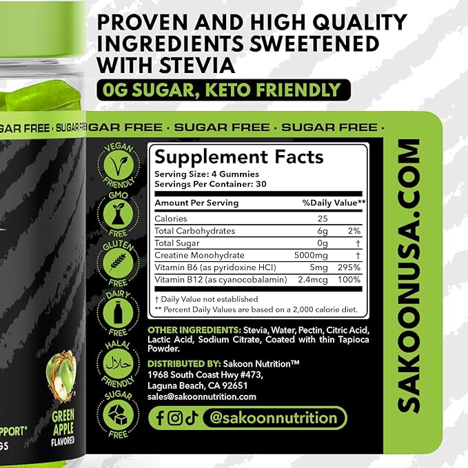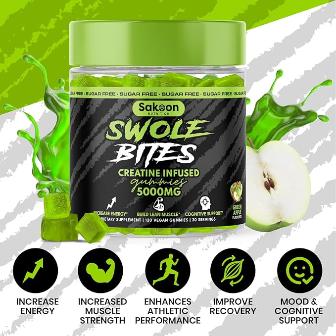 Sakoon nutrition 5000mg Creatine Monohydrate Infused Gummies | Increase Strength and Build Muscle, Sugar-Free, Vegan, Apple Flavor, 120 Count