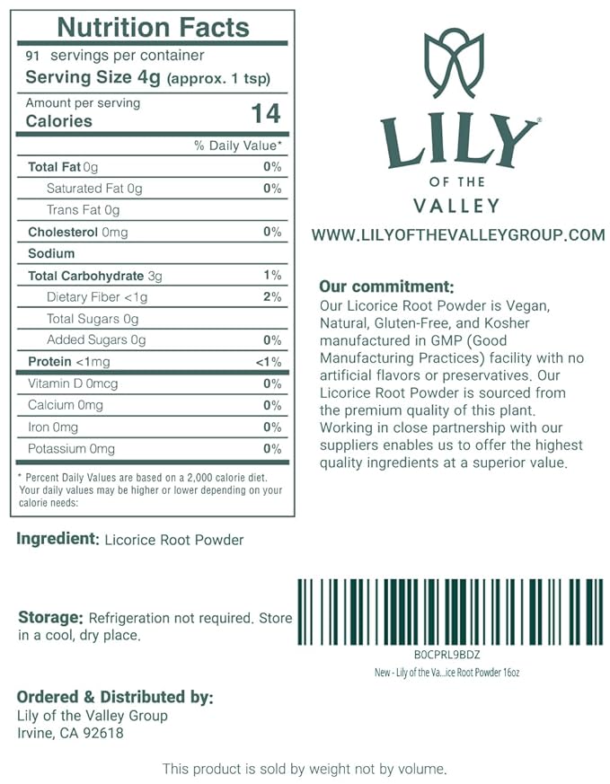 Lily of the Valley Licorice/Liquorice Root Powder - Ground Mulethi Sourced from India - Natural Sweetener - Vegan & Gluten-Free - Packed in Resealable Pouch (16oz, 453g)