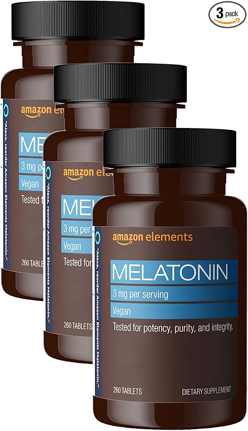 Amazon Elements Melatonin 3mg, Helps with Occasional sleeplessness, Vegan, Unflavored, 260 Tablets, 8 Month Supply (Packaging May Vary) (Pack of 3)