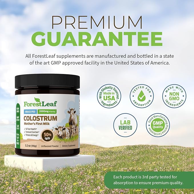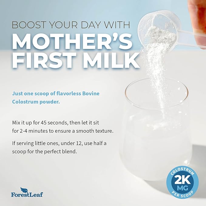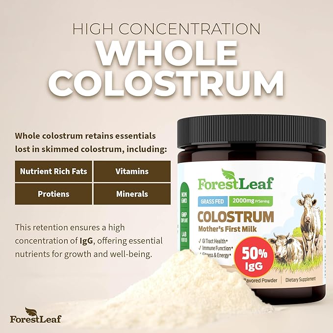 ForestLeaf Colostrum Powder 50% IgG Highest Pure Concentration, Grass Fed Colostrum Supplement for Gut Health, Immune Support and Muscle Recovery, Bovine Colostrum for Humans, Unflavored, 45 Servings