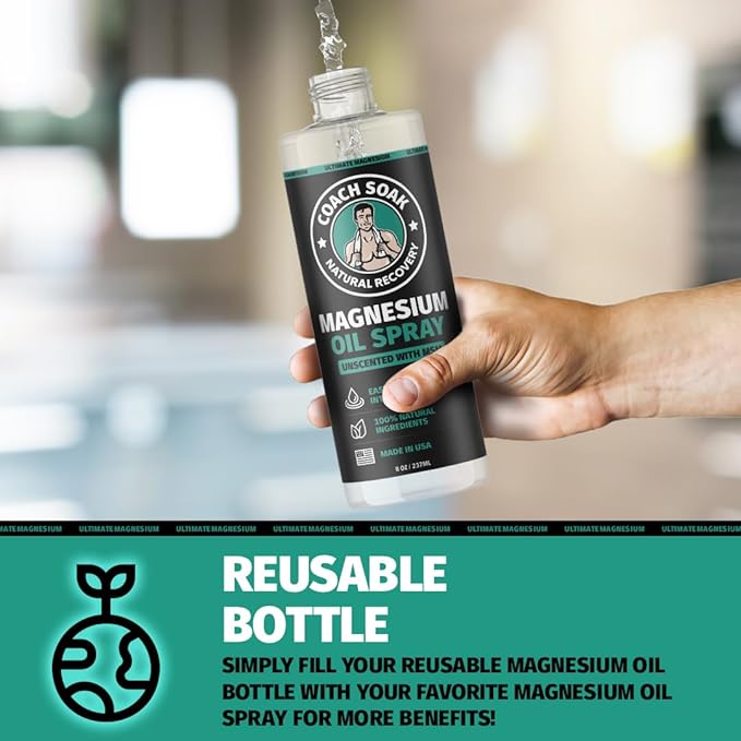 Coach Soak Magnesium Body Spray with MSM, Unscented, Extra Strength Magnesium Chloride, Pure Topical Magnesium Oil Spray for Feet & Body, Made in USA