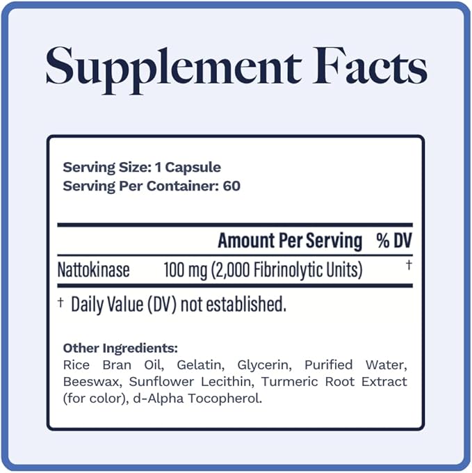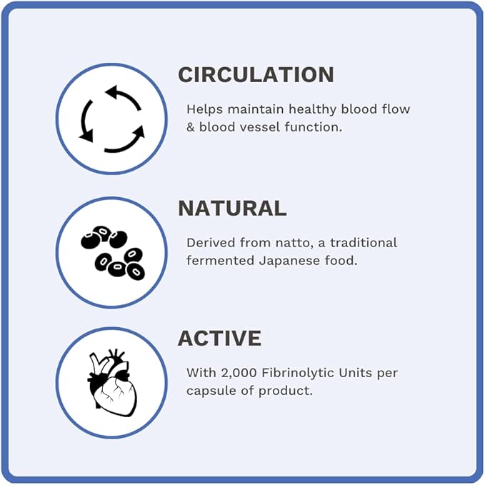 - Nattokinase helps maintain healthy blood flow & blood vessel function.