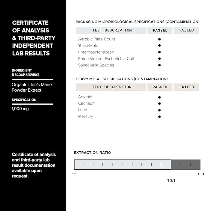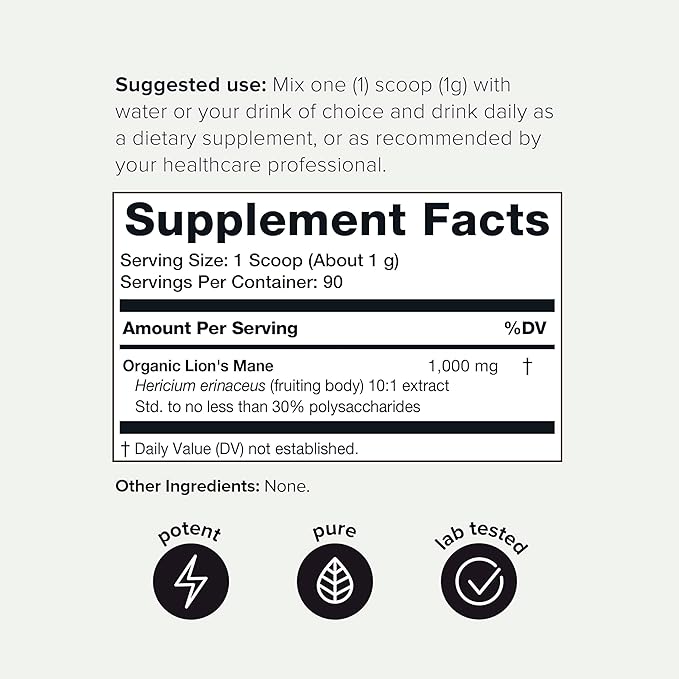 - Made From Pure Fruiting Bodies - Polysaccharides are renowned for their health-promoting effects, something other Lions Mane supplements don’t provide in high doses as it requires an extra step (and expense) in the manufacturing process. With 10X concentration in Toniiq Lion's Mane, you are getting one of the most optimal lion's mane products on the market.