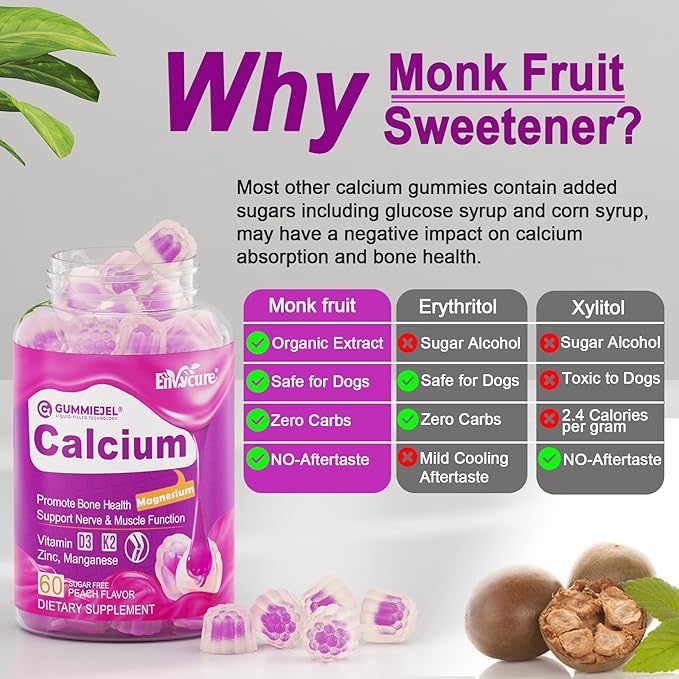 - Sugar-Free, Monk Fruit Sweeteners - Our Calcium Magnesium Zinc Gummies are sweetened with monk fruit, which is natural and 50% fewer calories than regular sugar, a good option if you don’t tolerate sugar alcohols like erythritol or xylitol. Compared to other sweeteners, it has no aftertaste, is harmless to dogs. With a chewy outer layer and a creamy, liquid center bursting with natural peach flavors, every bite is a tasty and nutritious treat for your body and taste buds.