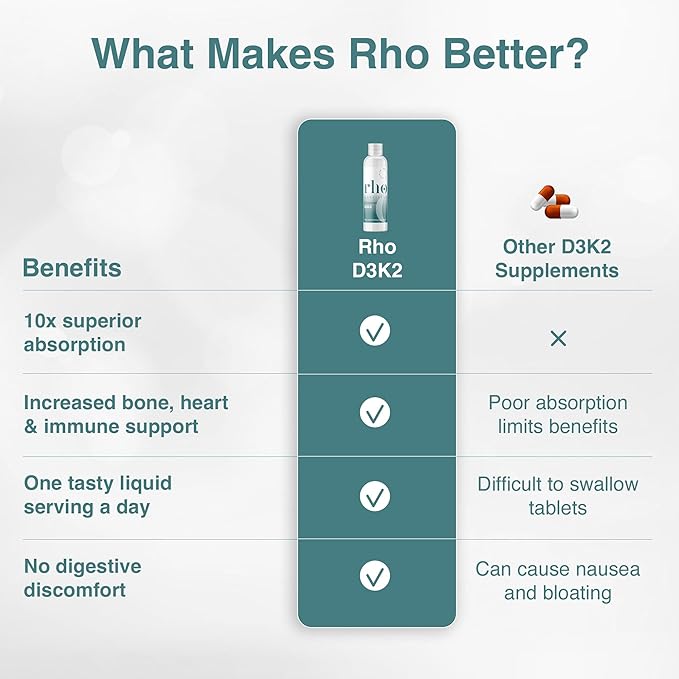 - 10X BETTER ABSORPTION: Liposomal technology encapsulates D3 & K2 in tiny pouches similar to cell membranes, increasing bioavailability and absorption by up to 10X. Rho bypasses the digestive system, ensuring superior absorption over traditional capsule, pill, and powder D3K2 supplements prone to minimal absorption and potential side effects.