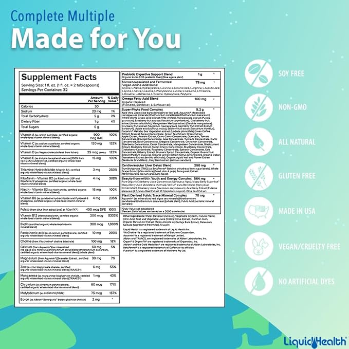 - ALLERGEN FREE & NO ARTIFICIAL INGREDIENTS: Our liquid vitamin supplements are 100% vegan, cruelty free, non-GMO, gluten free, dairy free, soy free, and contain no artificial dyes, flavors, fillers, or added sugars. Great for individuals with food sensitivities, allergies, or dietary restrictions and specially formulated for bariatric patients. 3rd Party ISO Lab certified and made in the USA!
