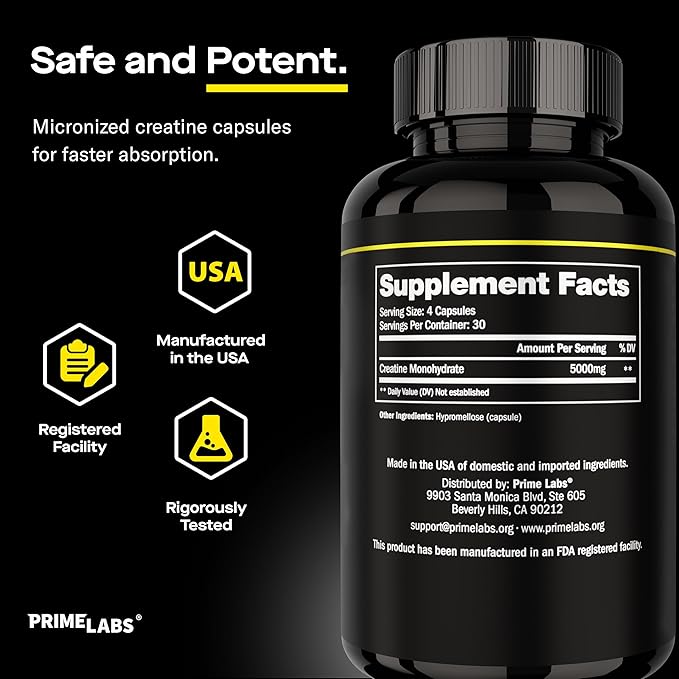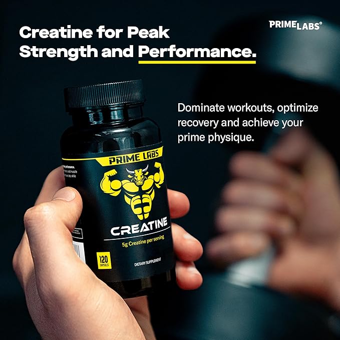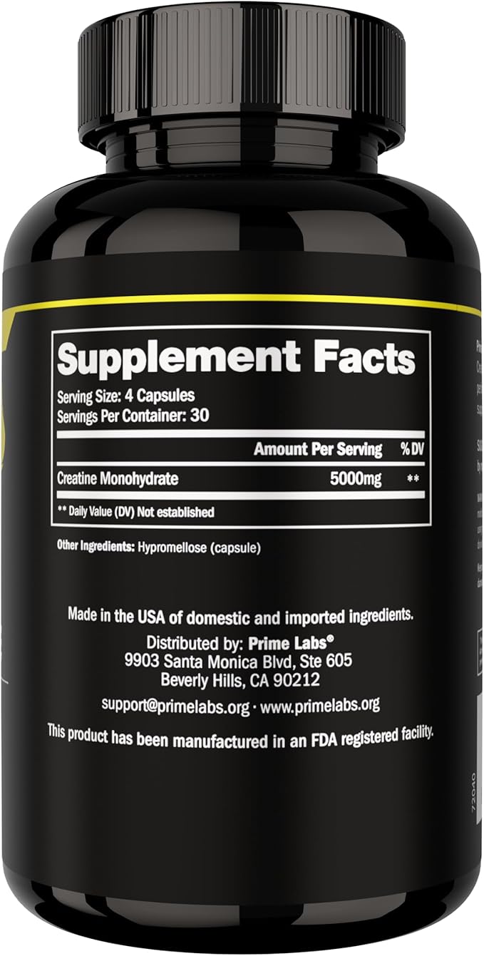 - Elevate Your Workout: Prime Labs Creatine Capsules provide 5g (5000mg) of pure creatine monohydrate per serving, perfect for muscle recovery and growth. Each bottle contains 120 capsules, with a serving size of 4 capsules daily.