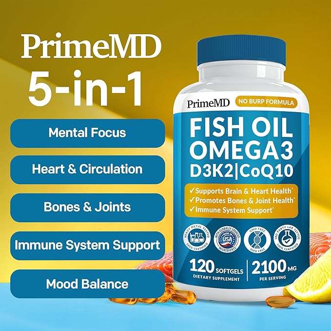 5-in-1 Fish Oil Omega 3 Fatty Supplements (2100mg) - Omega 3 Fish Oil with Vitamins D3 K2 and CoQ10 - Lemon Flavored (120 softgels)