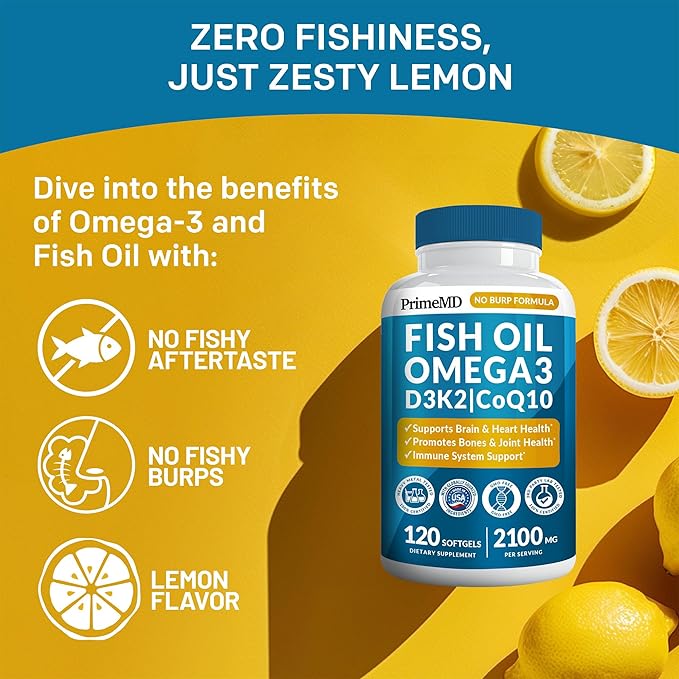 - Fish Oil 2000mg in Zesty Lemon: Enjoy 2000mg of Omega-3 Fish Oil without the fishy finish. Our easy-to-swallow softgels are designed for optimal heart, brain, and immune support, making daily wellness a pleasure.