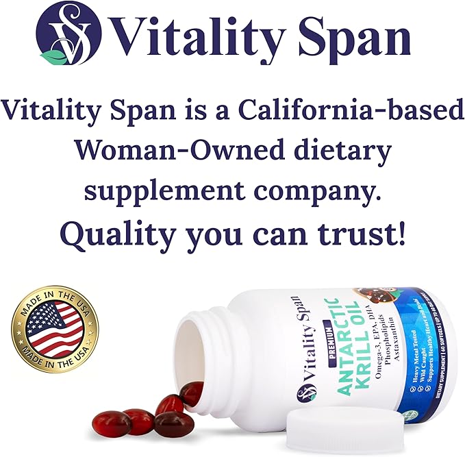 - ★ Vitality Span premium Antarctic Krill Oil manufactured at GMP Certified facility, 3rd-party tested, lab tested for heavy metals. Non-GMO. Directions: Take 1 softgel (500 mg) 1 to 2 times per day (up to 1000 mg per day), preferably with the meal. 60 easy-to-swallow softgels made with vanilla for no fishy aftertaste. Product Note: Exposure to heat or sunlight may lead to melting/damage of product. Hence customers are expected to be available during the product delivery.