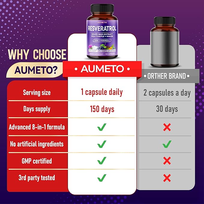 - Overall Wellness Boost: Aumeto Resveratrol promotes cellular wellness, supports healthy aging, boosts brain function, and enhances immunity.