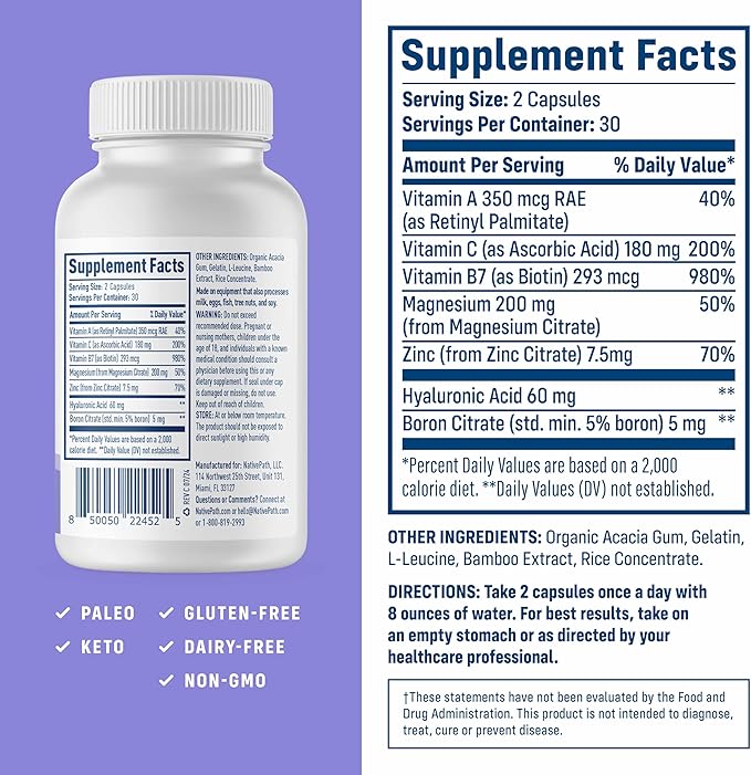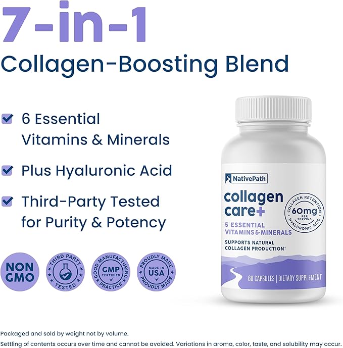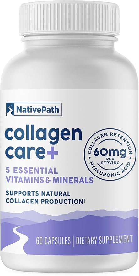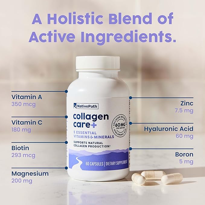 NativePath Collagen Care+, 5 Vitamin Blend with Hyaluronic Acid and Boron That Supports Collagen for Men and Women, 60 Capsules
