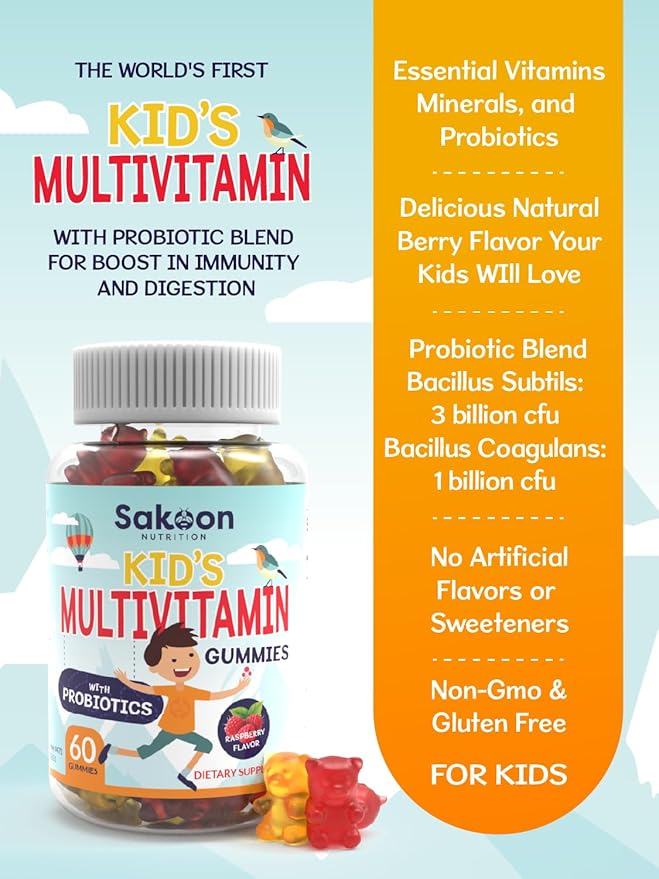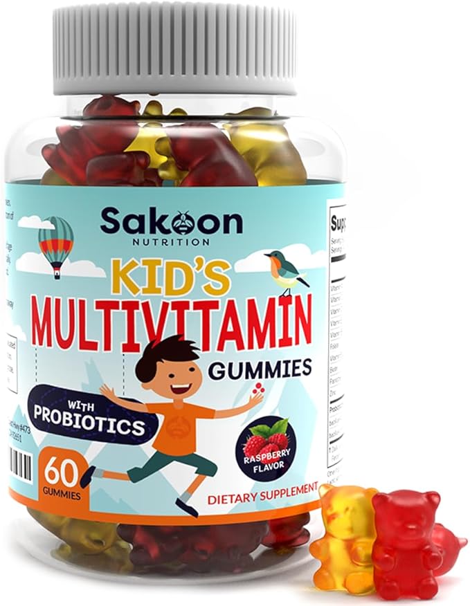 Sakoon nutrition Kids Multivitamin Gummies with Probiotics, 60 Count Raspberry Flavor| Vegetarian, Non-GMO, Gluten Free, Halal Children's Supplement
