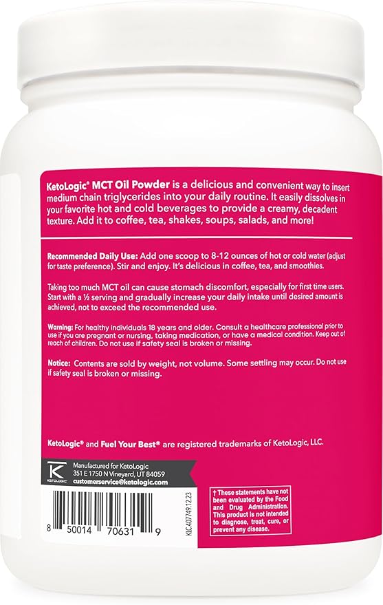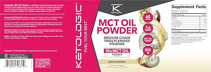 - Quality Assurance: Manufactured in an NSF Certified GMP Compliant facility and subjected to rigorous third-party testing by independent ISO-accredited laboratories, Ketologic's MCT Oil Powder guarantees the highest standards of quality and purity. Elevate your workouts with a delicious burst of clean energy.
