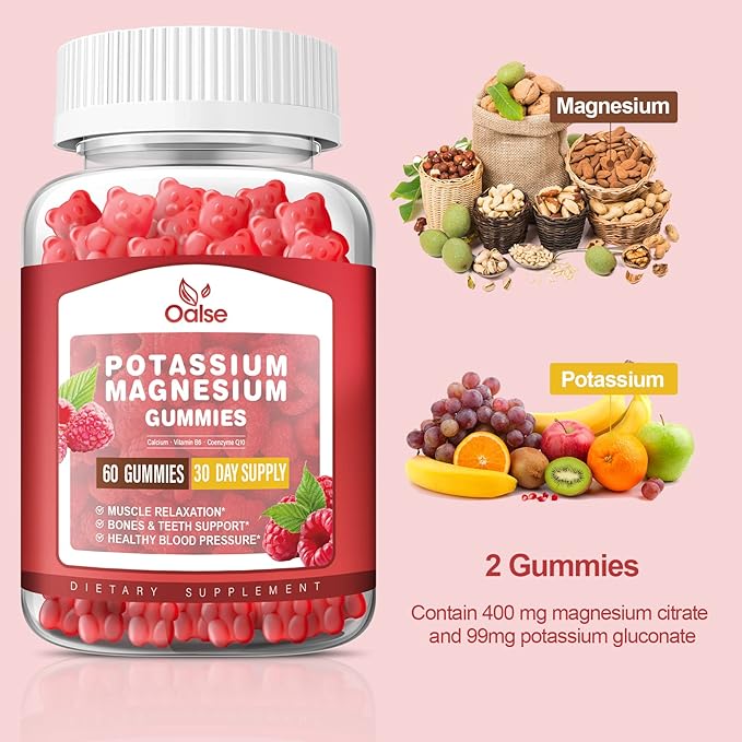 - Pectin-Based & Yummy Raspberry Flavor : Each Magnesium Gummy Is Made With Pectin Not Gelatin, And Is Gluten Free With No Artificial Flavors, No Synthetic Dyes. And Is Easier To Digest And Absorb Nutrients By Your Body.OALSE Potassium Vitamins Gummies Offers Gummies In A Blueberry Delicious.Our Delicious And Easy To Chewable Potassium Gummies Make Taking Your Daily Magnesium Supplement A Joy
