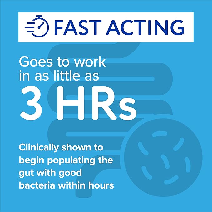 - FAST ACTING: New innovative fast acting probiotic that goes to work in as little as 3 hours. Clinically shown to survive the stomach acid and begin populating the gut with good bacteria within hours.