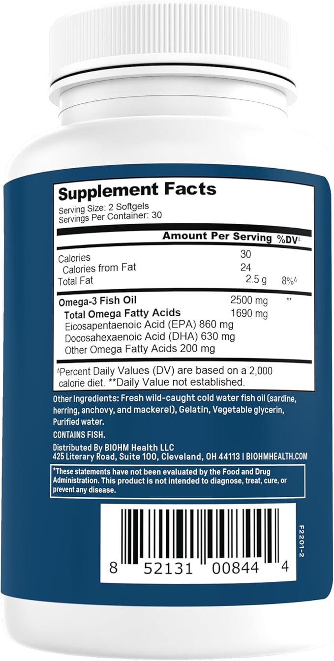 BIOHM Omega-3 Fish Oil (2500mg, 60 Softgels) High Potency 860mg EPA & 630mg DHA, Omega 3 Fatty Acid Supplements to Support Brain, Joint, Eye, Liver & Gut Health, Sustainably Sourced