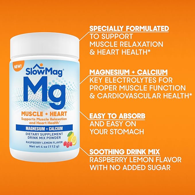 SlowMag® Magnesium Powder, Magnesium + Calcium Supplement Drink Mix, Raspberry Lemon Flavor, Supports Muscle Relaxation & Heart Health, 4oz