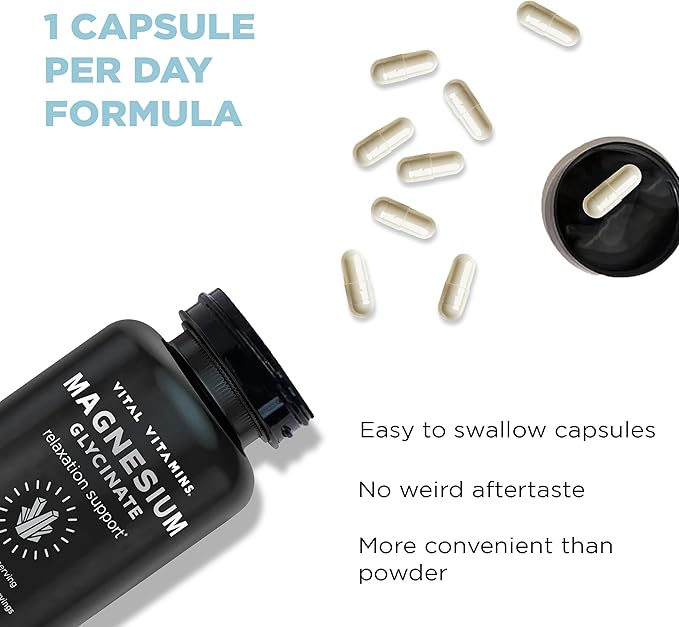 - Relaxation Support: Vital Vitamins Magnesium Glycinate promotes deep relaxation, calmness, and improved sleep quality by helping reduce stress and muscle tension, making it the ideal supplement for unwinding and supporting restful nights.